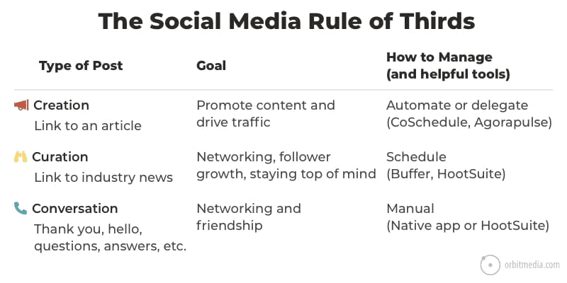 Andy Crestodina of Orbit Media describes and explains a great method of social media management called the Social Media Rule of Thirds. Where you focus on the three main types of social media posts. Creation, Curation, and Conversation.